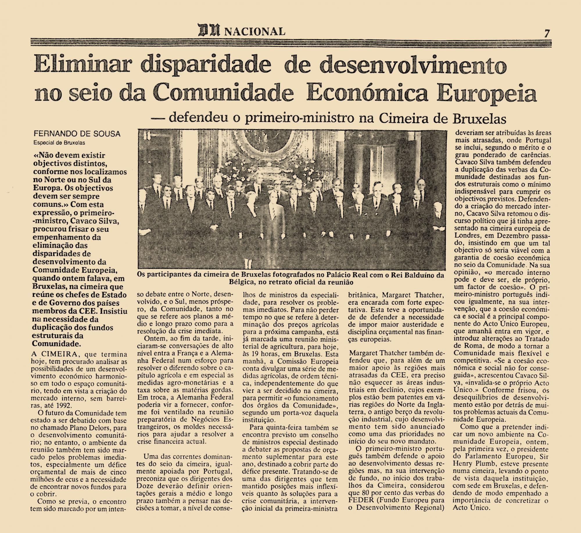 “Não devem existir objectivos distintos, conforme nos localizamos no Norte ou no Sul da Europa. Os objectivos devem ser sempre comuns.” Com esta expressão, o primeiro-ministro, Cavaco Silva, procurou frisar o seu empenhamento da eliminação das disparidades de desenvolvimento da Comunidade Europeia, quando ontem falava, em Bruxelas, na cimeira que reúne os chefes de Estado e de Governo dos países membros da CEE. Insistiu na necessidade da duplicação dos fundos estruturais da Comunidade.