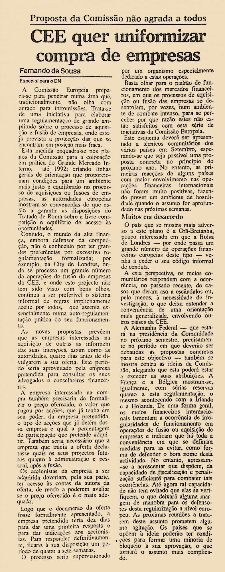 A Comissão Europeia prepara-se para penetrar numa área que, tradicionalmente, não olha com agrado para intromissões. Trata-se de uma iniciativa para elaborar uma regulamentação de grande amplitude sobre o processo de aquisição e fusão de empresas, onde esteja prevista a protecção das que se encontram em posição mais fraca.