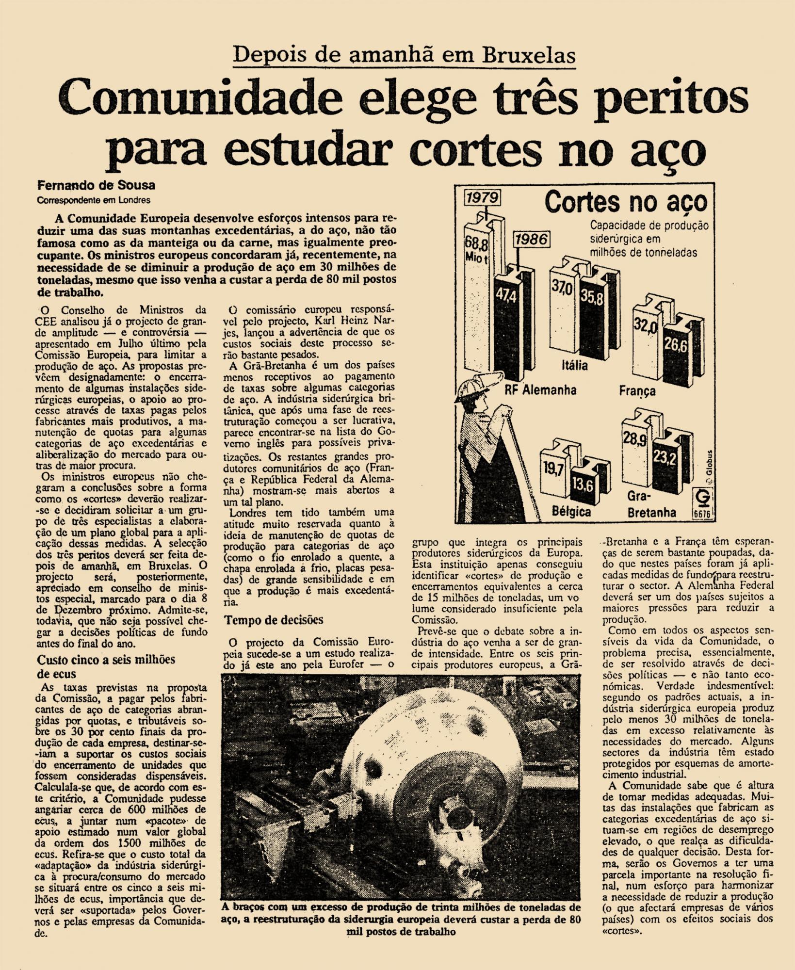 A Comunidade Europeia desenvolve esforços intensos para reduzir uma das suas montanhas excedentárias, a do aço, não tão famosa como as da manteiga ou da carne, mas igualmente preocupante. Os ministros europeus concordaram já, recentemente, na necessidade de se diminuir a produção de aço em 30 milhões de toneladas mesmo que isso venha a custar a perda de 80 mil postos de trabalho.