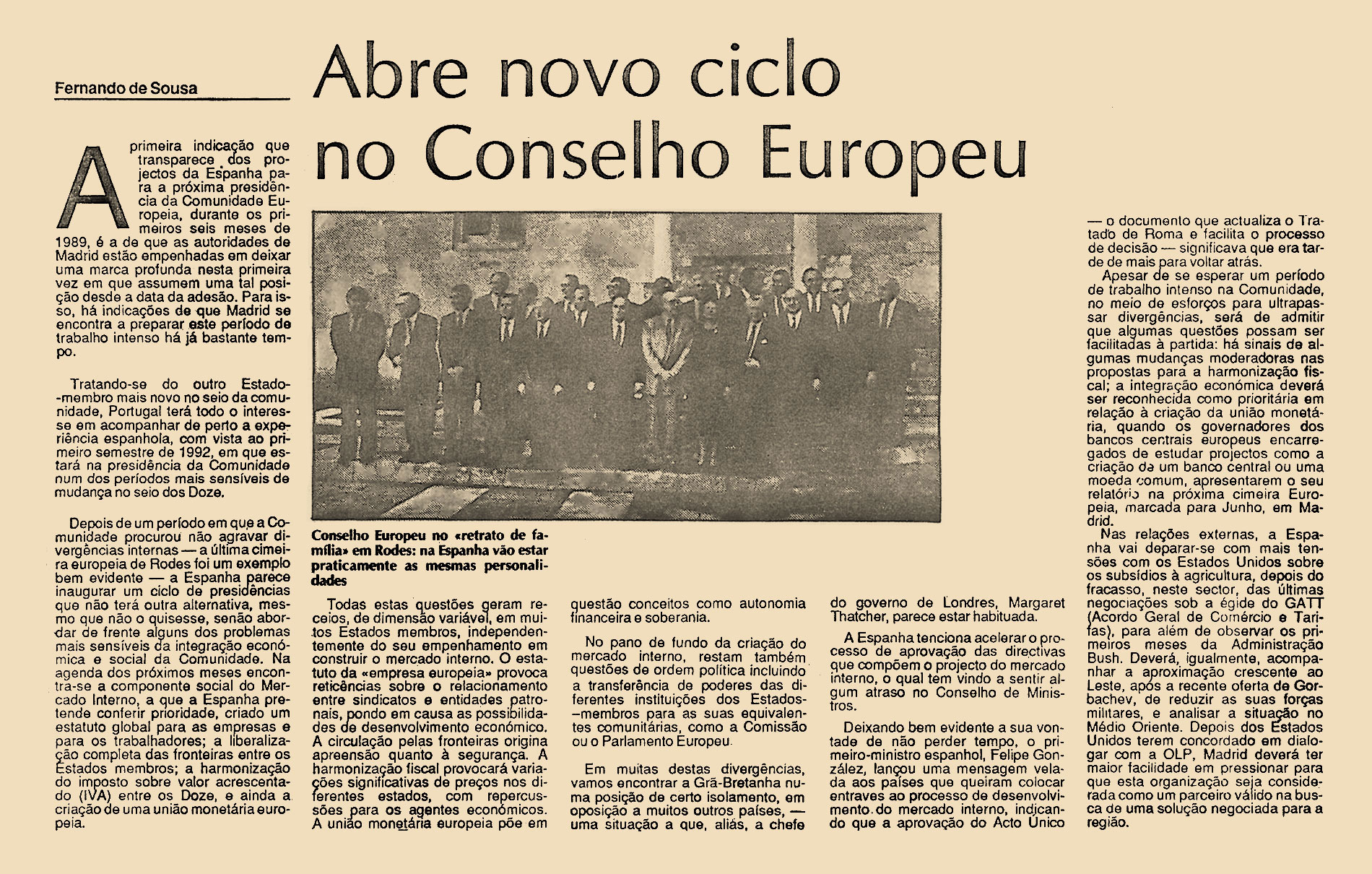 A primeira indicação que transparece dos projectos da Espanha para a próxima presidência da Comunidade Europeia, durante os primeiros seis meses de 1989, é a de que as autoridades de Madrid estão empenhadas em deixar uma marca profunda nesta primeira vez que em assumem uma tal posição desde a data de adesão. Para isso, há indicações de que Madrid se encontra a preparar este período de trabalho intenso há já bastante tempo.