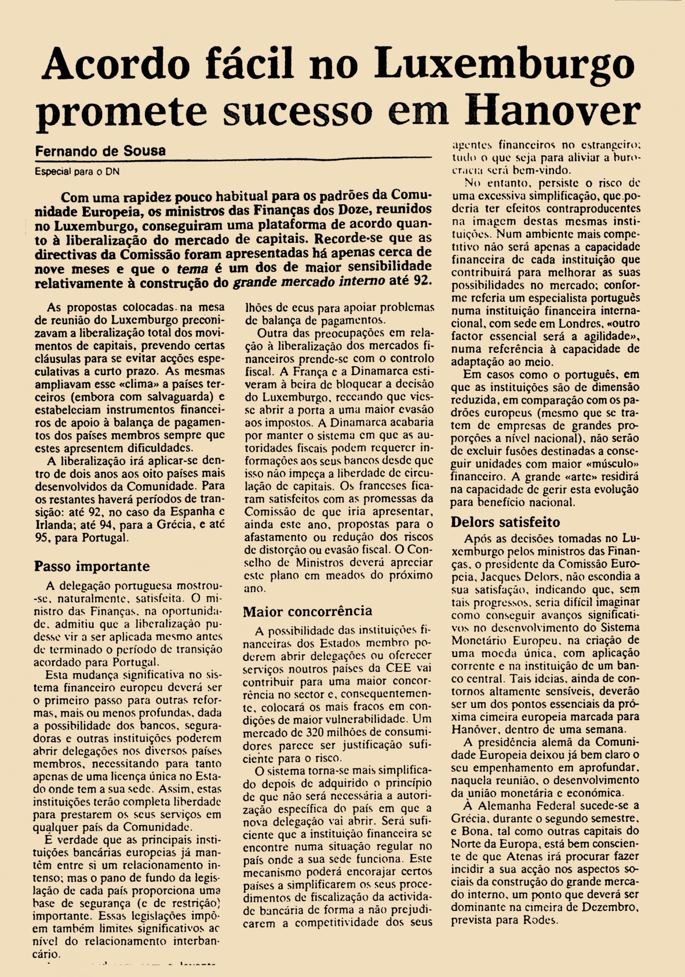 Com uma rapidez pouco habitual para os padrões da Comunidade Europeia, os ministros das Finanças dos Doze, reunidos no Luxemburgo, conseguiram uma plataforma de acordo quando à liberalização do mercado de capitais. Recorde-se que as directivas da Comissão foram apresentadas há apenas cerca de nove meses e que o tema é um dos de maior sensibilidades relativamente à construção do grande mercado interno até 92.