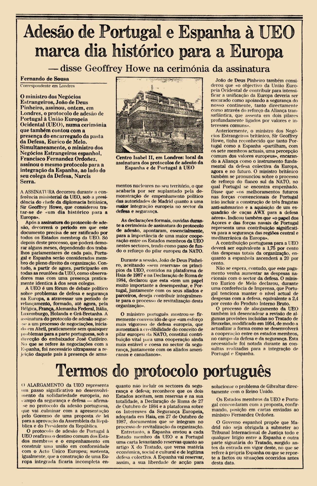 O ministro dos Negócios Estrangeiros, João de Deus Pinheiro, assinou, ontem, em Londres, o protocolo de adesão de Portugal à União Europeia Ocidental (UEO), numa cerimónia que também contou com a presença do encarregado da pasta da Defesa , Eurico de Melo. Simultaneamente, o ministro dos Negócios Estrangeiros espanhol, Francisco Fernandez Ordoñez, assinou o mesmo protocolo para a integração da Espanha, ao lado do seu colega da Defesa, Narcis Serra.