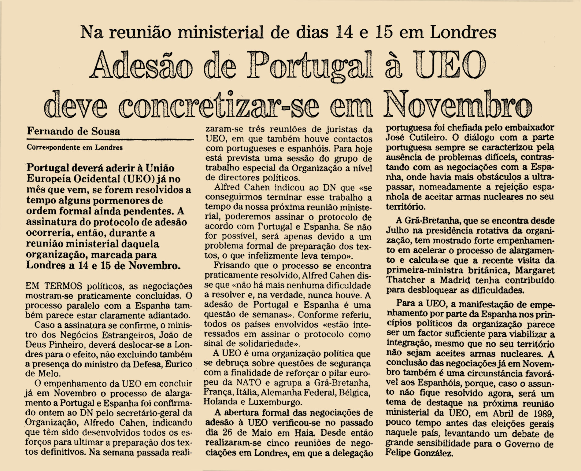 Portugal deverá aderir à União Europeia Ocidental (UEO) já no mês que vem, e forem resolvidos a tempo alguns pormenores de ordem formal ainda pendentes. A assinatura do protocolo de adesão ocorreria, então durante a reunião ministerial daquela organização, marcada para Londres a 14 e 15 de Novembro.