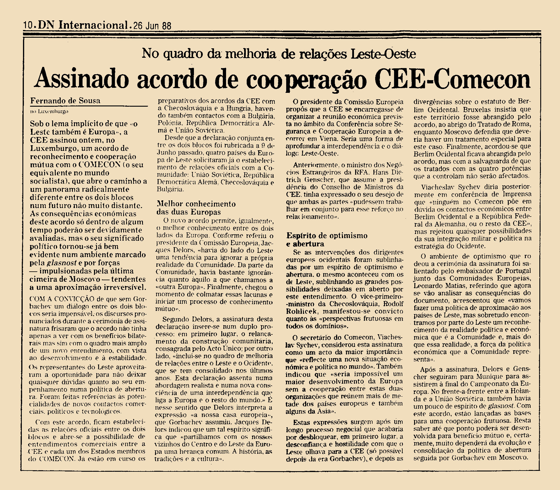 Sobre o lema implícito de que “o Leste também é Europa”, a CEE assinou ontem, no Luxemburgo, um acordo de reconhecimento e cooperação mútua com o COMECON (o seu equivalente no mundo socialista), que abre o caminho a um panorama radicalemnte diferente entre os dois blocos num futuro não muito distante. As consequências económicas deste acordo só dentre de algum tempo poderão ser devidamente avaliadas, mas o seu significado político tornou-se já bem evidente num ambiente marcado pelas glasnost e por forças – impulsionadas pela última cimeira de Moscovo – tendentes a uma aproximação irreversível.