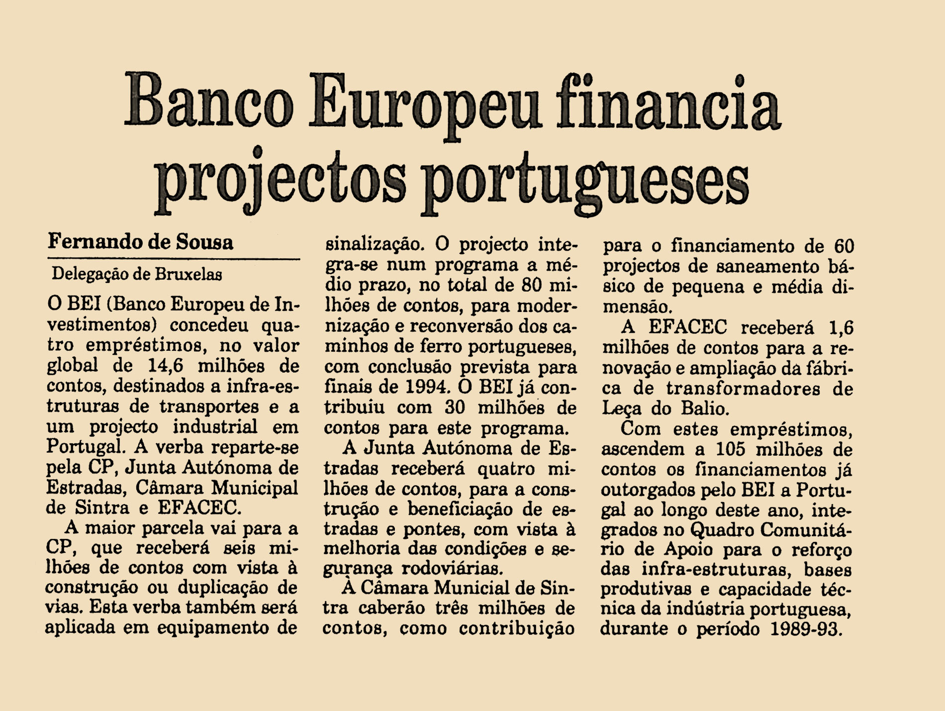 O BEI (Banco Europeu de Investimentos) concedeu quatro empréstimos, no valor global de 14.6 milhões de contos, destinados a infra-estruturas de transportes e a um projecto industrial em Portugal. A verba reparte-se pela CP, Junta Autónoma de Estradas, Câmara Municipal de Sintra e EFACEC.