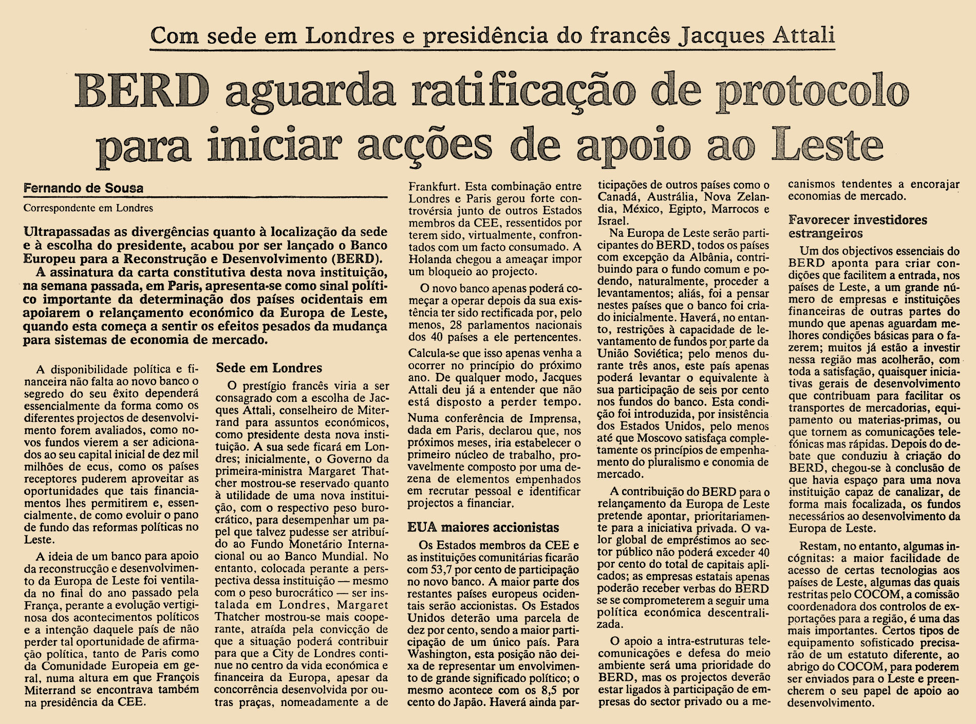 A assinatura da cara constitutiva desta nova instituição, na semana passada, em Paris, apresenta-se como sinal político importante da determinação dos países ocidentais em apoiarem o relançamento económico da Europa de Leste, quando esta começa a sentir os efeitos pesados da mudança para sistemas de economia de mercado.