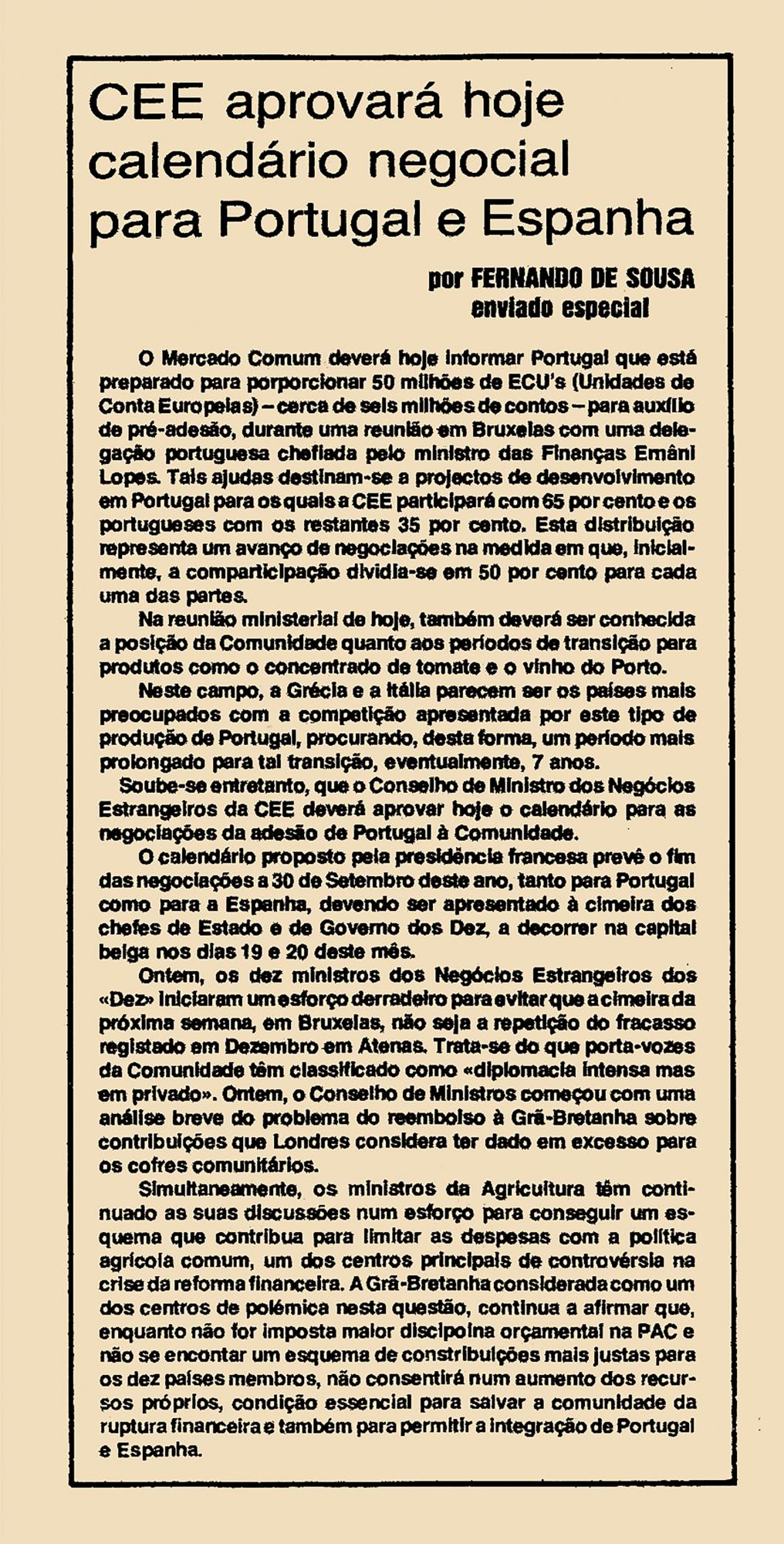 O Mercado Comum deverá hoje informar Portugal que está preparado para proporcionar 50 milhões de ECU’s (Unidades de Conta Europeias) – cerca de seis milhões de contos – para auxílio de pré-adesão, durante uma reunião em Bruxelas com uma delegação portuguesa chefiada pelo ministros das Finanças Ernâni Lopes, Tais ajudas destinam-se a projectos de desenvolvimento em Portugal para os quais a CEE participará com 65 por cento e os portugeueses com os restantes 35 por cento. Esta distribuição representa um avanço de negociações na medida em que, inicialmente, a comparticipação dividia-se em 50 por cento para cada uma das partes.