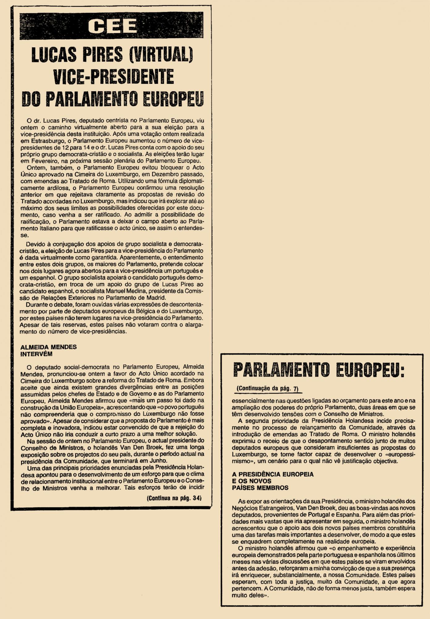 O Dr. Lucas Pires, deputado centrista no Parlamento Europeu, viu ontem o caminho virtualmente aberto para a sua eleição para a vice-presidência desta instituição. Após uma votação ontem realizada em Estrasburgo, o Parlamento Europeu aumento o número de vice-presidentes de 12 para 14 e o Dr. Lucas Pires conta com o apoio do seu próprio grupo democrata-cristão e o socialista. As eleições terão lugar em Fevereiro, na próxima sessão plenária do Parlamento Europeu.