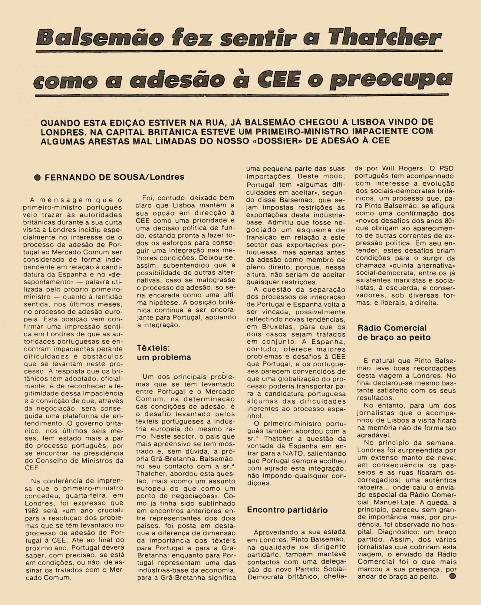 O ministro dos Negócios Estrangeiros, André Gonçalves Pereira, reforçou anteontem, à noite, em Londres, a defesa da indústria têxtil portuguesa no processo de adesão de Portugal ao Mercado Comum.