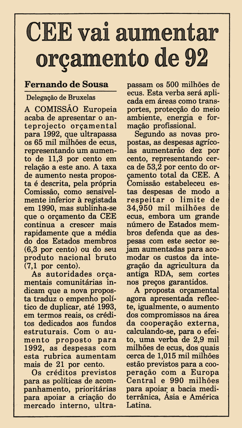 A Comissão Europeia acaba de apresentar o anteprojecto orçamental para 1992, que ultrapassa os 65 mil milhões de ecus, representando um aumento de 11.3 por cento em relação a este ano. A taxa de aumento nesta proposta é descrita, pela própria Comissão, como sensivelmente inferior à registada em 1990, mas sublinha-se que o orçamento da CEE continua a crescer mais rapidamente que a média do dos Estados membros (6.3 por cento) ou do seu produto nacional bruto (7.1 por cento).
