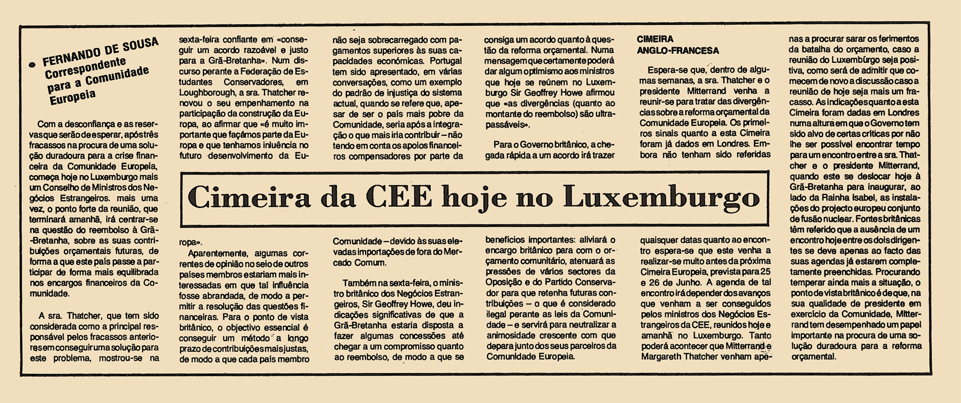 Com a desconfiança e as reservas que serão de esperar, após três fracassos na procura de uma solução duradoura para a crise financeira da Comunidade Europeia, começa hoje no Luxemburgo mais um Conselho de Ministros dos Negócios Estrangeiros. Mais uma vez, o ponto forte da reunião, que terminará amanhã, irá centrar-se na questão do reembolso à Grã-Bretanha, sobre as suas contribuições orçamentais futuras, de forma a que este país passe a participar de froma mais equilibrada nos encargos financeiros da Comunidade.