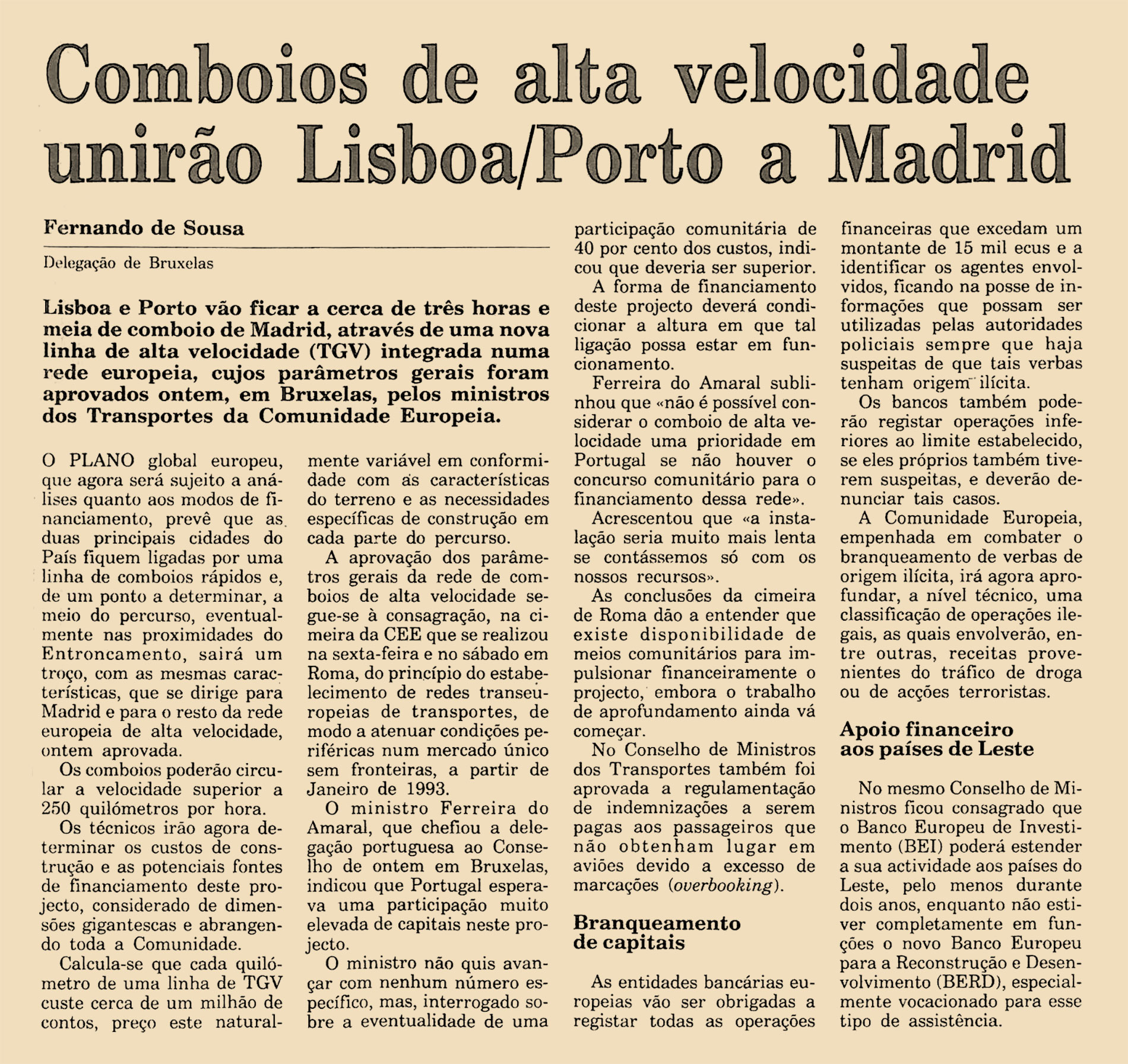 Lisboa e Porto vão ficar a cerca de três horas e meia de comboio de Madrid, através de uma nova linha de alta velocidade (TGV) integrada numa rede europeia, cujos parâmetros gerais foram aprovados ontem, em Bruxelas, pelos ministros dos Transportes da Comunidade Europeia.