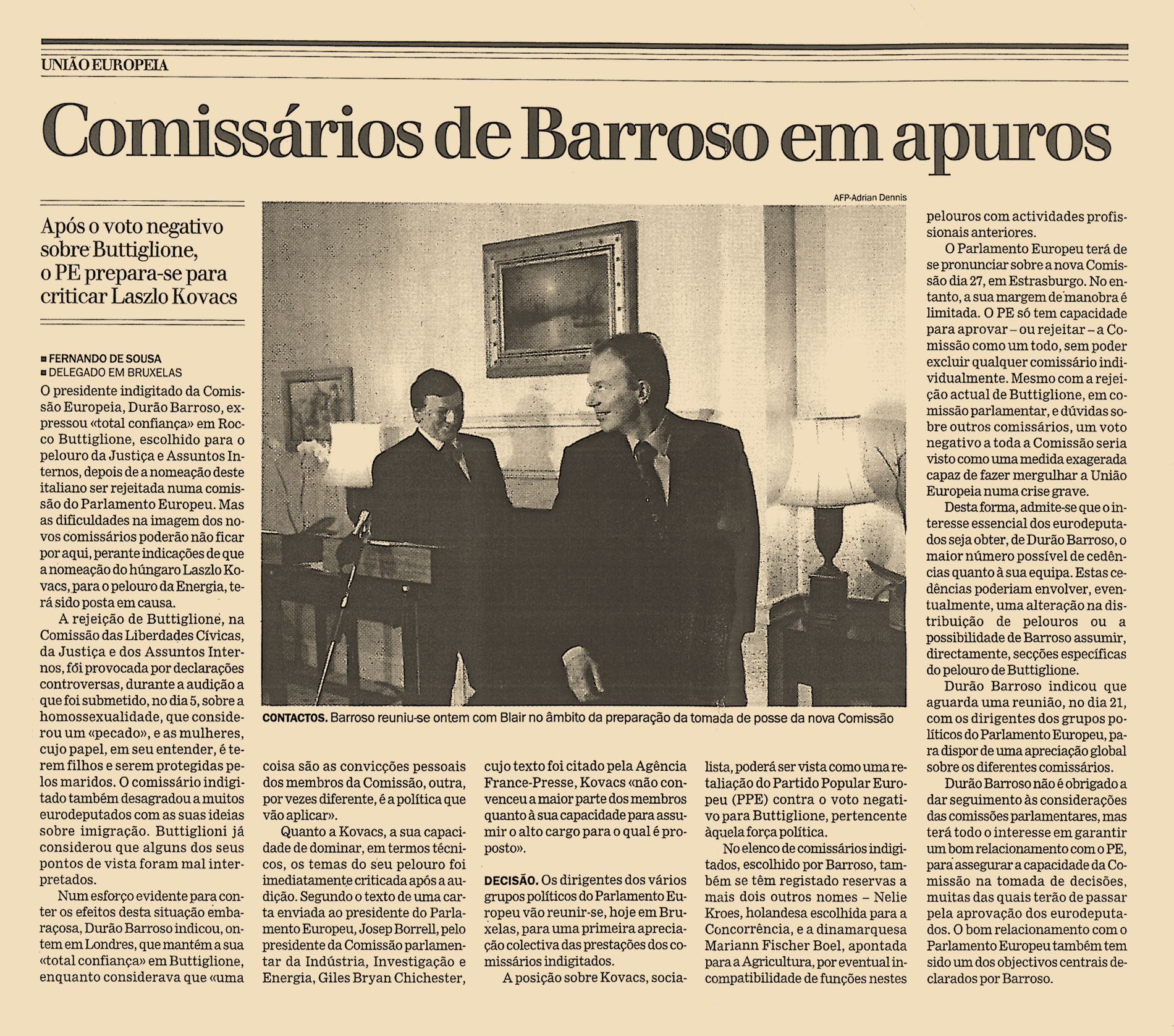 O presidente indigitado da Comissão Europeia, Durão Barroso, expressou “total confiança“ em Roco Buttiglione, escolhido para o pelouro da Justiça e Assuntos Internos, depois de a nomeação deste italiano ser rejeitada numa comissão do Parlamento Europeu. Mas as dificuldades na imagem dos novos comissários poderão não ficar por aqui, perante indicações de que a nomeação do húngaro Laszlo Kovacs, para o pelouro da Energia, terá sido posta em causa.