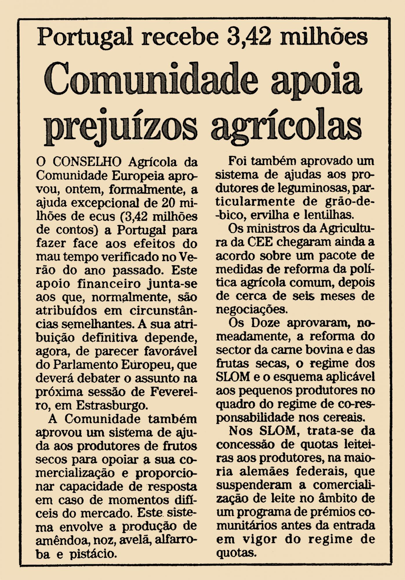 O conselho agrícola da Comunidade Europeia aprovou, ontem, formalmente, a ajuda excepcional de 20 milhões de ecus (3.42 milhões de contos) a Portugal para fazer face aos efeitos do mau tempo verificado no Verão do ano passado. Este apoio financeiro junta-se aos que, normalmente, são atribuídos em circunstâncias semelhantes. A sua atribuição definitiva depende agora, de parecer favorável do Parlamento Europeu, que deverá debater o assunto na próxima sessão de Fevereiro, em Estrasburgo.