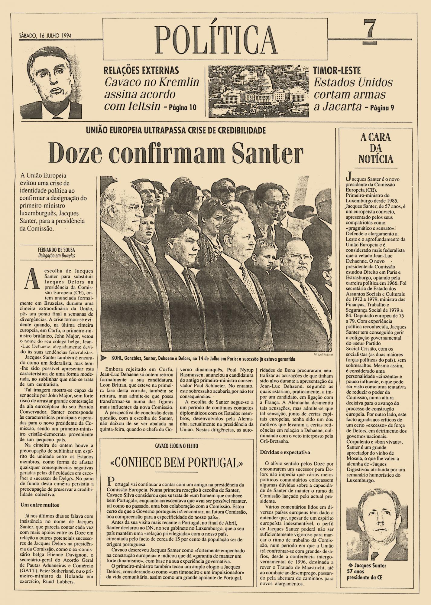 A União Europeia evitou uma crise de identidade política ao confirmar a designação do primeiro-ministro luxemburguês, Jacques Santer, para a presidência da Comissão.