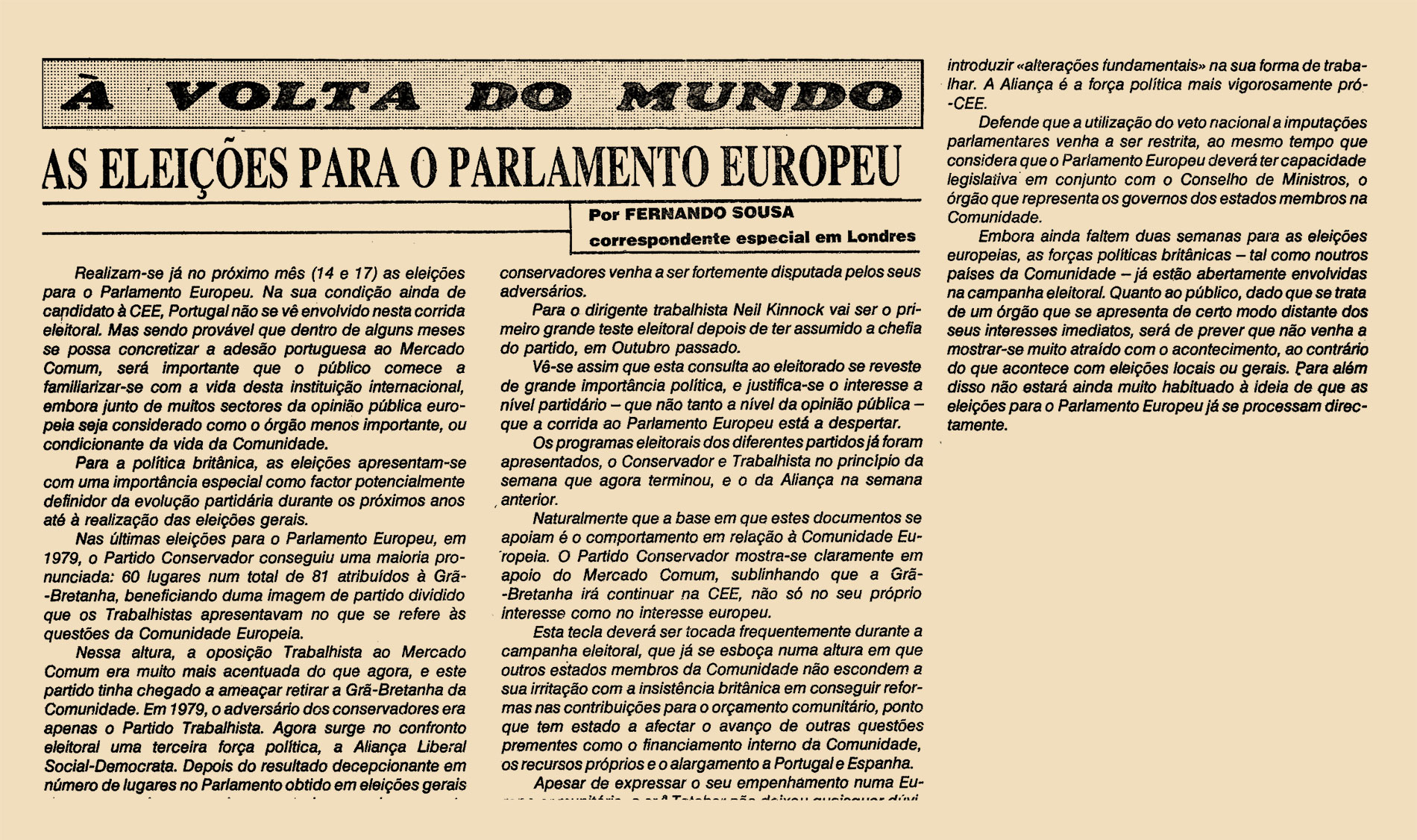 Realizam-se já no próximo mês (14 e 17) as eleições para o Parlamento Europeu. Na sua condição ainda de candidato à CEE, Portugal não se vê envolvido nesta corrida eleitoral. Mas sendo provável que dentro de alguns meses se possa concretizar a adesão portuguesa ao Mercado Comum, será importante que o público comece a familiarizar-se com a vida desta instituição internacional, embora junto de muitos sectores da opinião pública europeia seja considerado como o órgão menos importante, ou condicionante da vida da Comunidade.