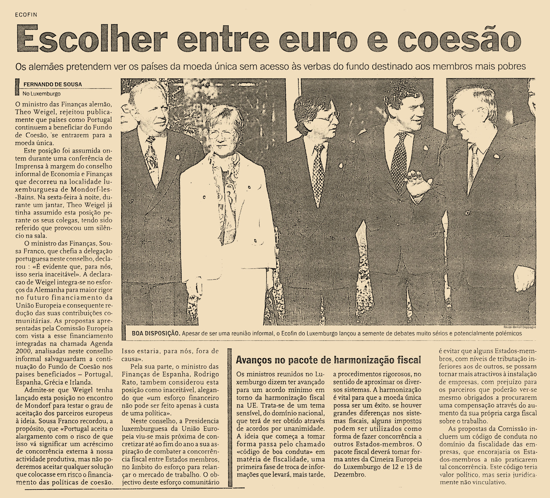 O ministro das Finanças alemão, Theo Weigel, rejeitou publicamente que países como Portugal continuem a beneficiar do Fundo de Coesão, se entrarem para a moeda única.