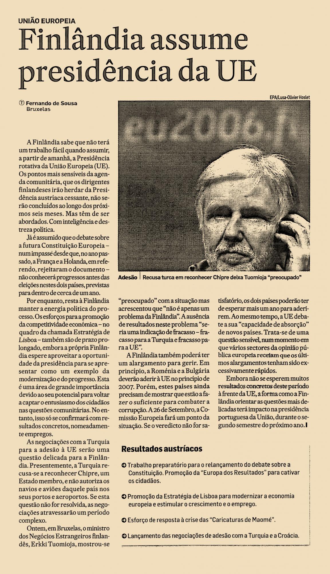 A Finlândia sabe que não terá um trabalho fácil quando assumir, a partir de amanhã, a Presidência rotativa da União Europeia (UE). Os pontos mais sensíveis da agenda comunitária, que os dirigentes finlandeses irão herdar da Presidência austríaca cessante, não serão concluídos ao longo dos próximos seis meses. Mas têm de ser abordados. Com inteligência e destreza política.