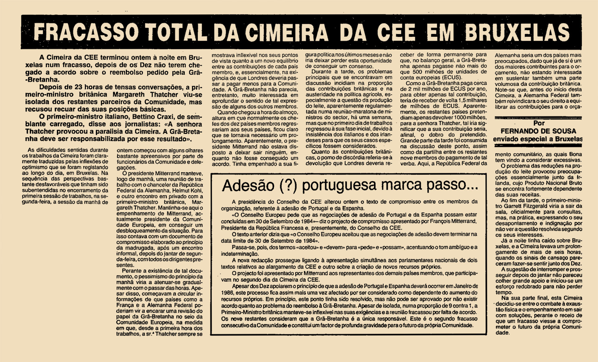 A Cimeira da CEE terminou ontem à noite em Bruxelas num fracasso, depois de os Dez não terem chegado a acordo sobre o reembolso pedido pela Grã-Bretanha.