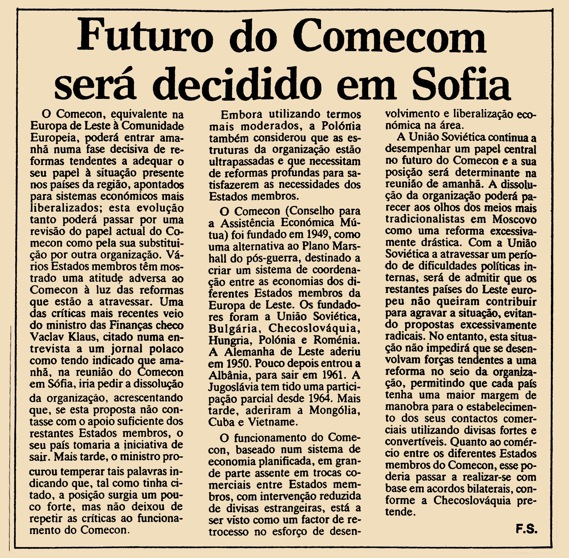 O Comecom, equivalente na Europa de Leste à Comunidade Europeia, poderá entrar amanhã numa fase decisiva de reformas tendentes a adequar o seu papel à situação presente nos países da região, apontados para sistemas económicos mais liberalizados; esta evolução tanto poderá passar por uma revisão do papel actual do Comecon como pela sua substituição por outra organização. Vários Estados membros têm mostrado uma atitude adversa ao Comecon à luz das reformas que estão a atravessar. Uma das críticas mais recentes veio do ministro das Finanças checo Vaclav Klaus, citado numa entrevista a um jornal pola como tendo indicado que amanhã, na reunião do Comecon em Sófia iria pedir a dissolução da organização, acrescentando que, se esta proposta não contasse com o apoio suficiente dos restantes Estados membros, o seu país tomaria a iniciativa de sair. Mais tarde, o ministro procurou temperar tais palavras indicando que, tal como tinha citado, a posição surgia um pouco forte, mas não deixou de repetir as críticas ao funcionamento do Comecon.
