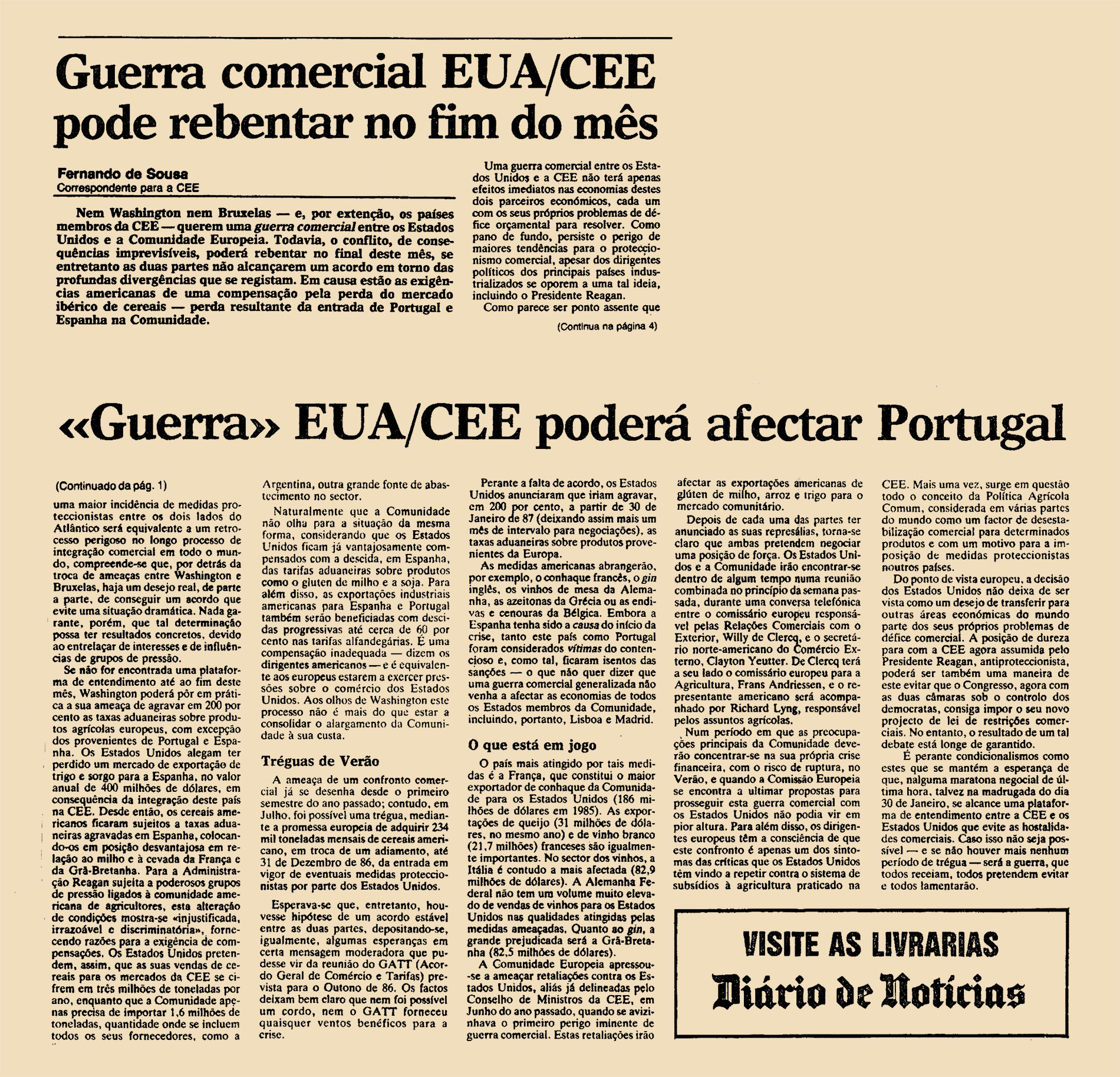 Nem Washington nem Bruxelas – e, por extensão, os países membros da CEE – querem uma guerra comercial entre os Estados Unidos e a Comunidade Europeia. Todavia, o conflito, de consequências imprevisíveis, poderá rebentar no final deste mês, se entretanto as duas partes não alcançarem um acordo em torno das profundas divergências que se registam. Em causa estão as exigências americanas de uma compensação pela perda do mercado ibérico de cereais – perda resultante da entrada de Portugal e Espanha na Comunidade.