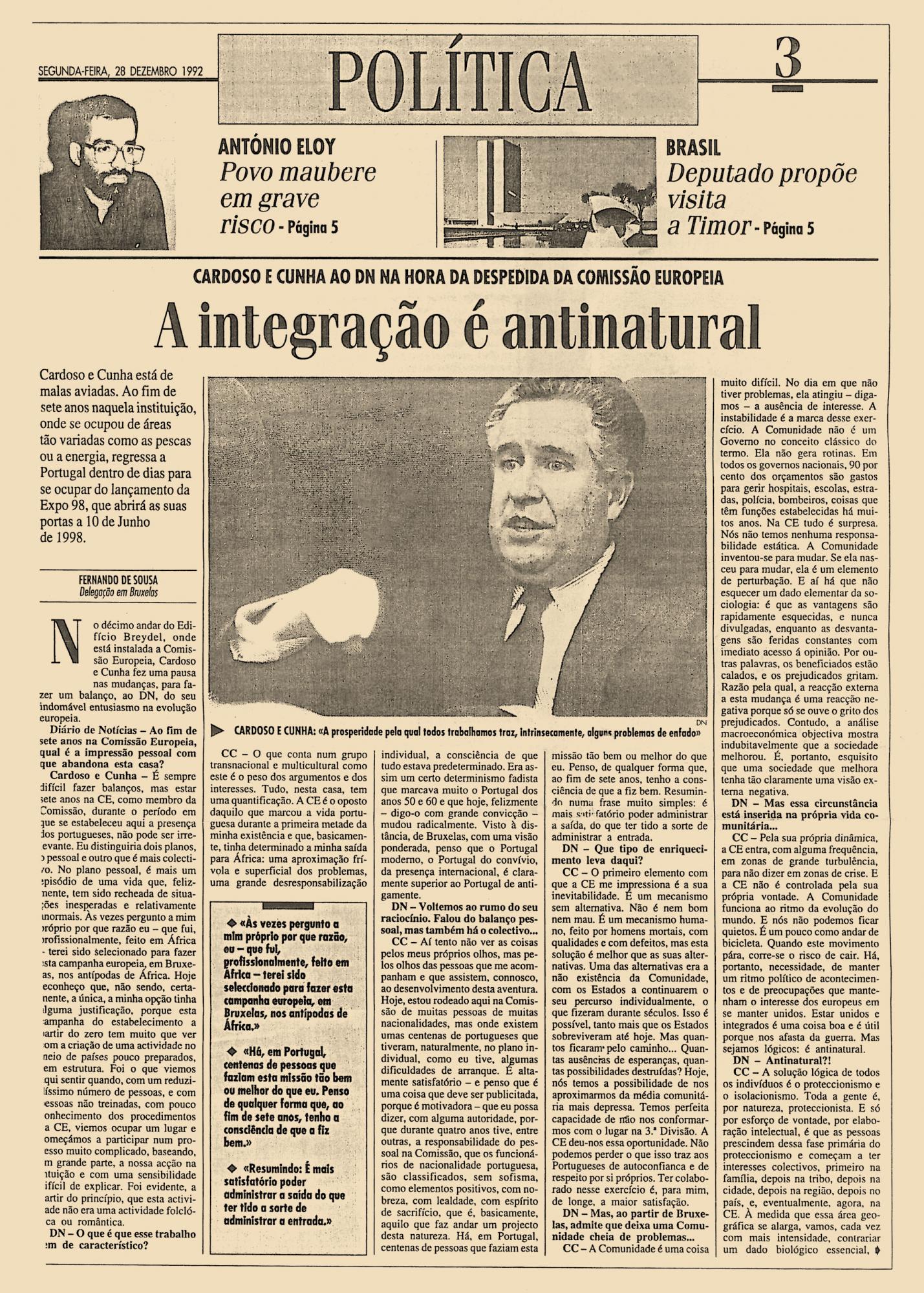 Cardoso e Cunha está de malas aviadas. Ao fim de sete anos naquela instituição, onde se ocupou de áreas tão variadas como as pescas ou a energia, regressa a Portugal dentro de dias para se ocupar do lançamento da Expo 98, que abrirá as suas portas a 10 de Junho de 1998.
