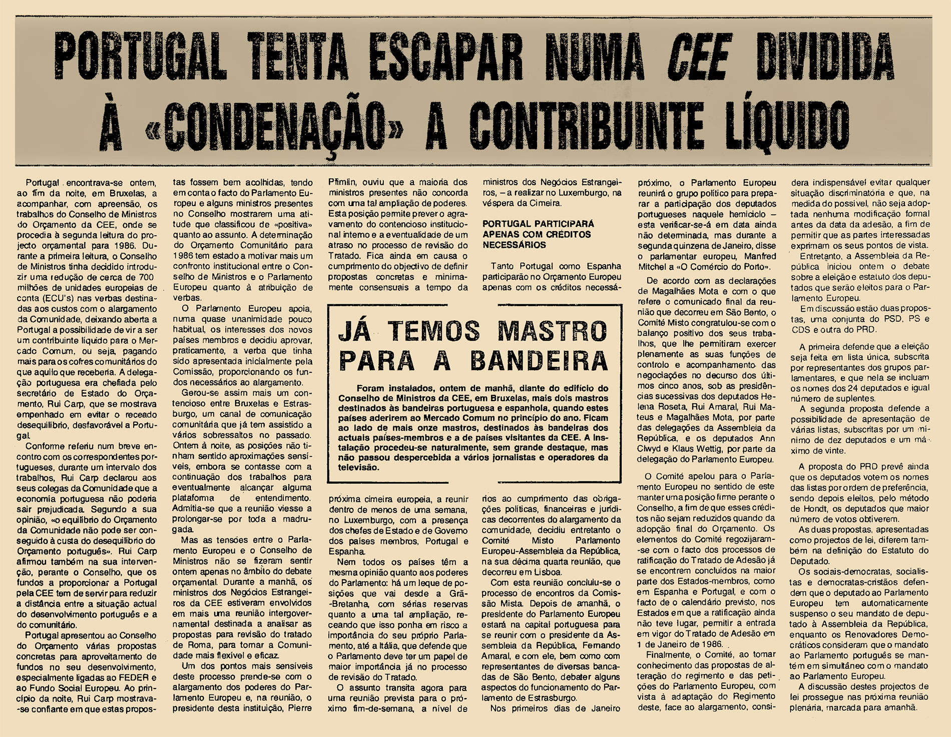Foram instalados, ontem de manhã, diante do edifício do Conselho de Ministros da CEE, em Bruxelas, mais dois mastros destinados às bandeiras portuguesa e espanhola, quando estes países aderirem ao Mercado Comum no príncipio do ano. Ficam ao lado de mais onze mastros, destinados às bandeiras dos actuais países-membros e a de países visitantes da CEE. A instalação procedeu-se naturalmente, sem grande destaque, mas não passou despercebida a vários jornalistas e operadores da televisão.