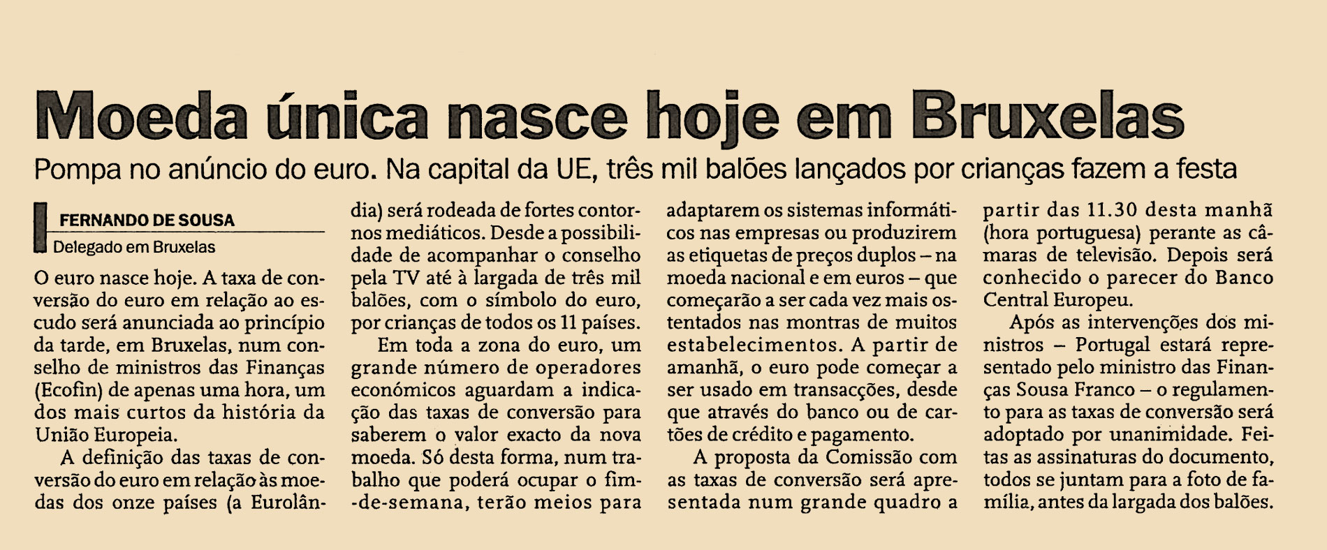 O euro nasce hoje. A taxa de conversão do euro em relação ao escudo será anunciada ao princípio da tarde, em Bruxelas, num conselho de ministros das Finanças (Ecofin) de apenas uma hora, um dos mais curtos da história da União Europeia.