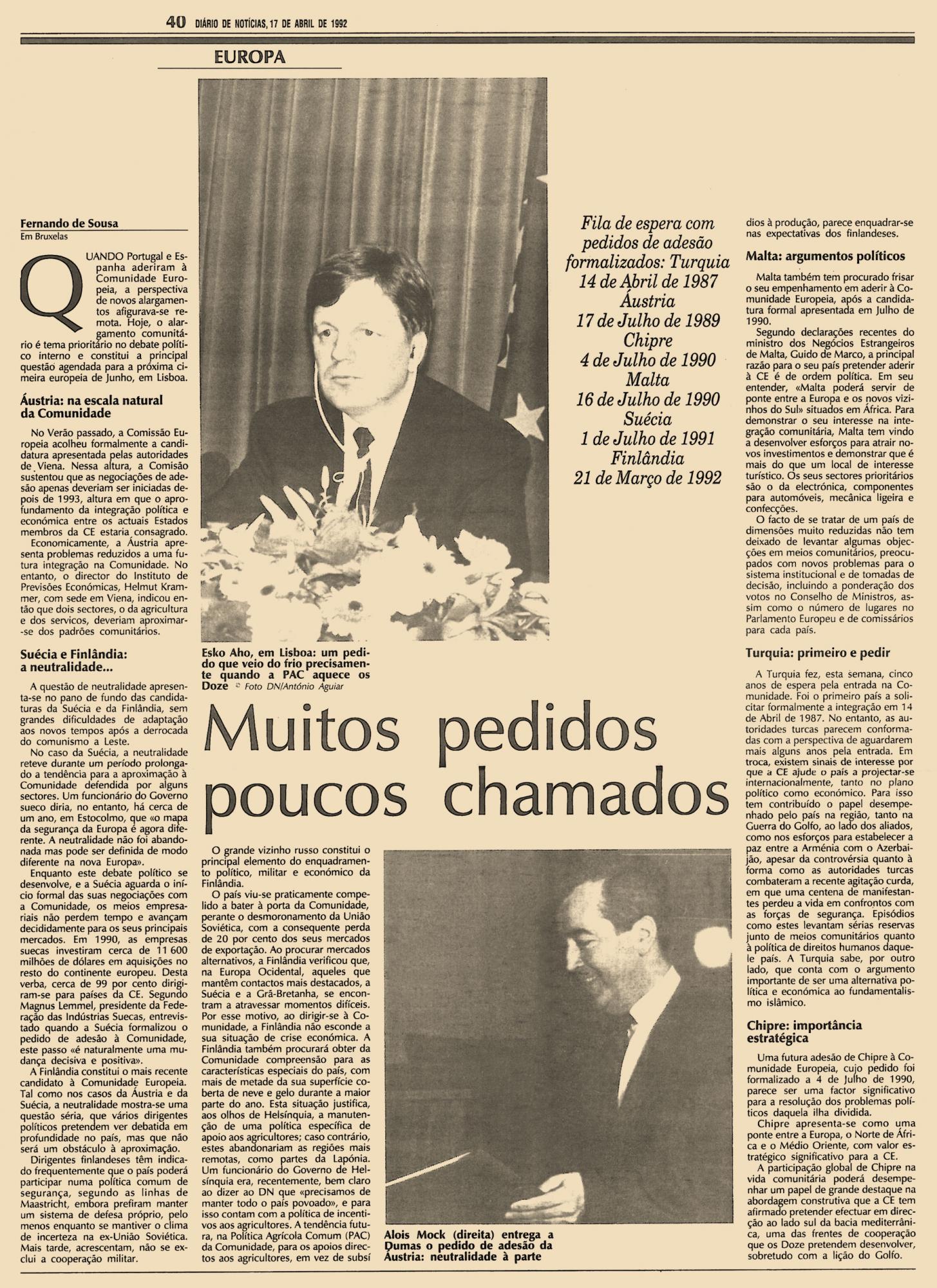 Quando Portugal e Espanha aderiram à Comunidade Europeia, a perspectiva de novos alargamentos afigurava-se remota. Hoje, o alargamento comunitário é tema prioritário no debate político interno e constitui a principal questão agendada para a próxima cimeira europeia de Junho, em Lisboa.