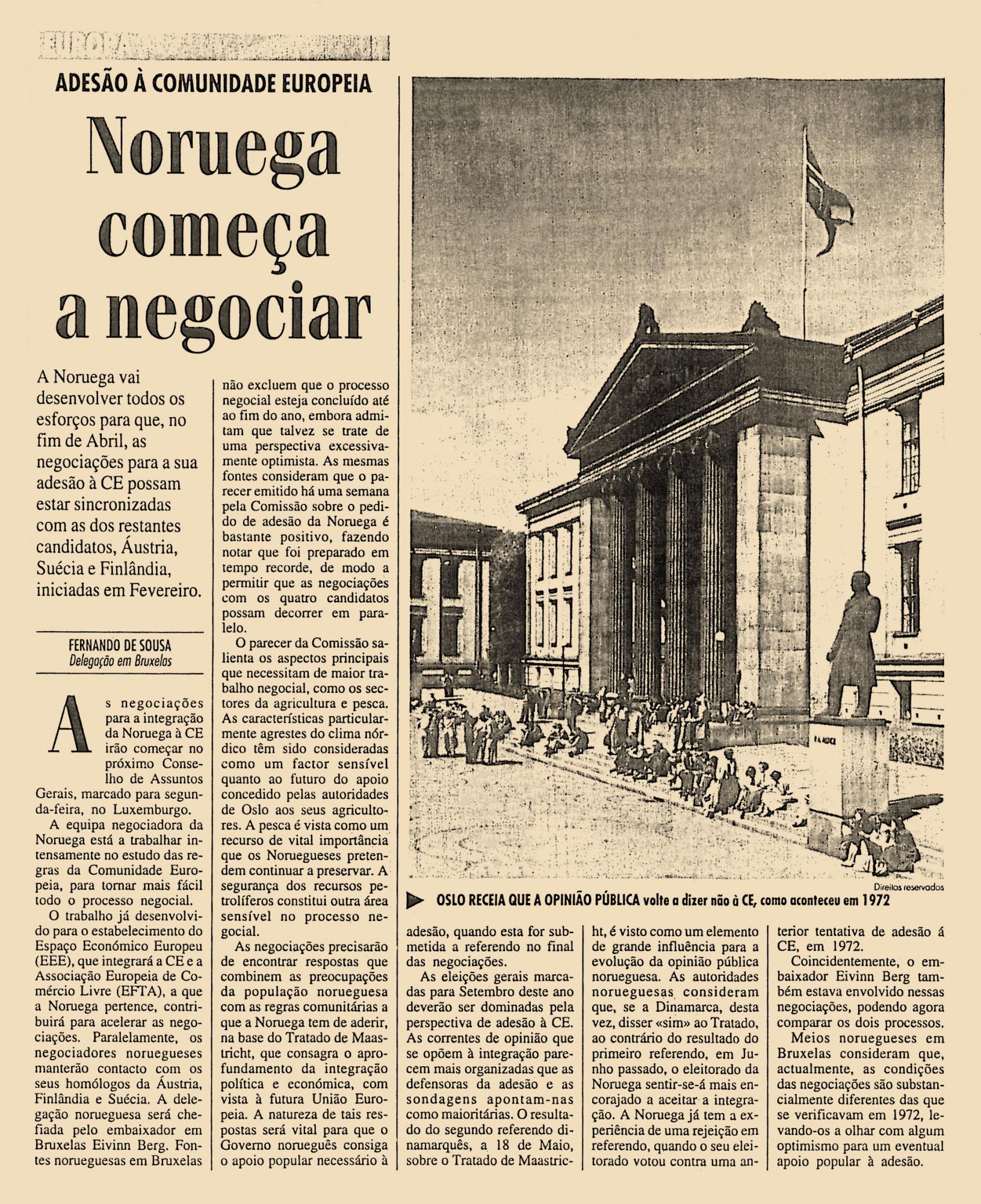 A Noruega vai desenvolver todos os esforços para que, no fim de Abril, as negociações para a sua adesão à CE possam estar sincronizadas com as dos restantes candidatos, Áustria, Suécia e Finlândia, iniciadas em Fevereiro.