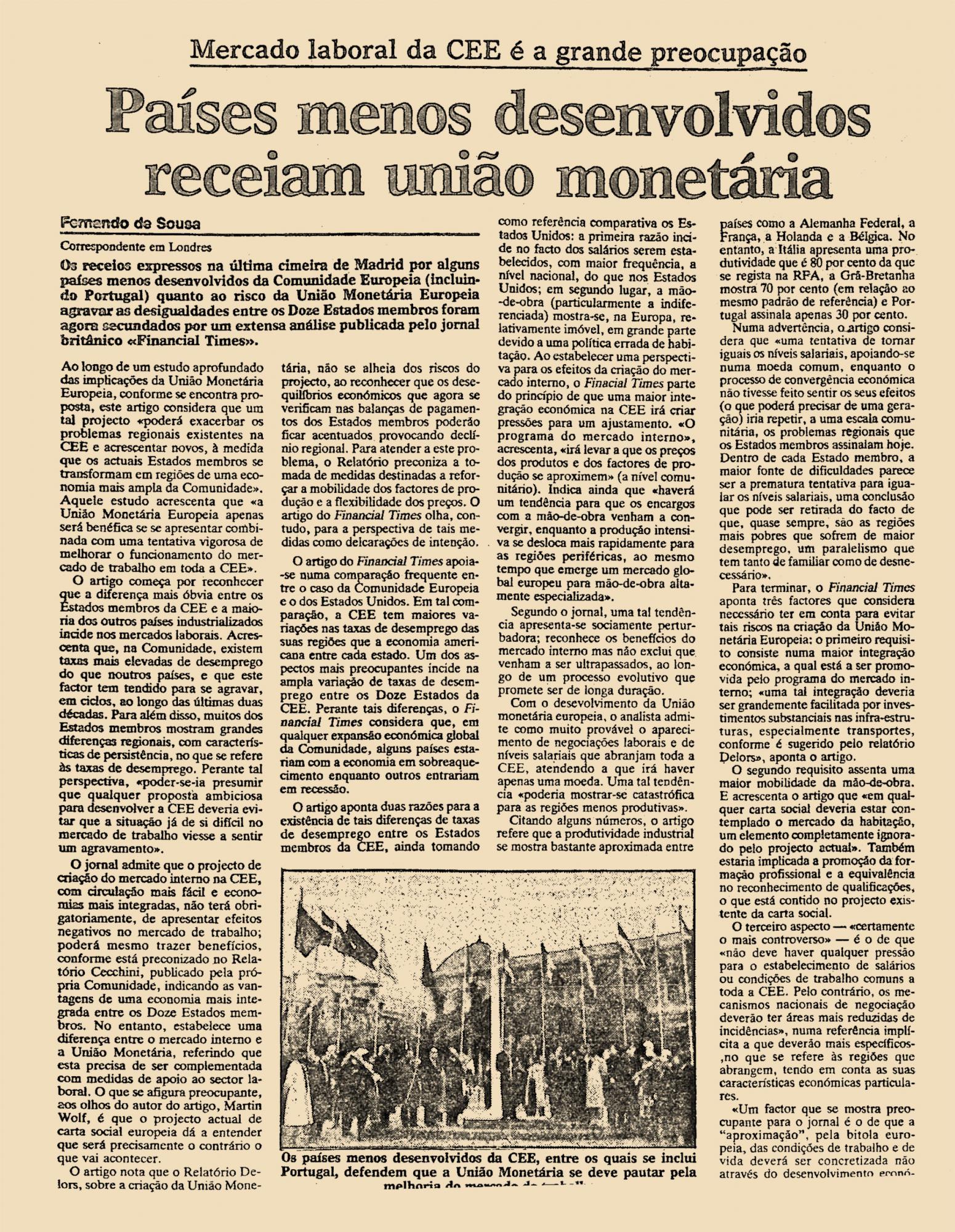 Os receios expressos na última cimeira de Madrid por alguns países menos desenvolvidos da Comunidade Europeia (incluindo Portugal) quanto ao risco da União Monetária Europeia agravar as desigualdades entre os Doze Estados membros foram agora secundados por uma extensa análise publicada pelo jornal britânico “Financial Times”.