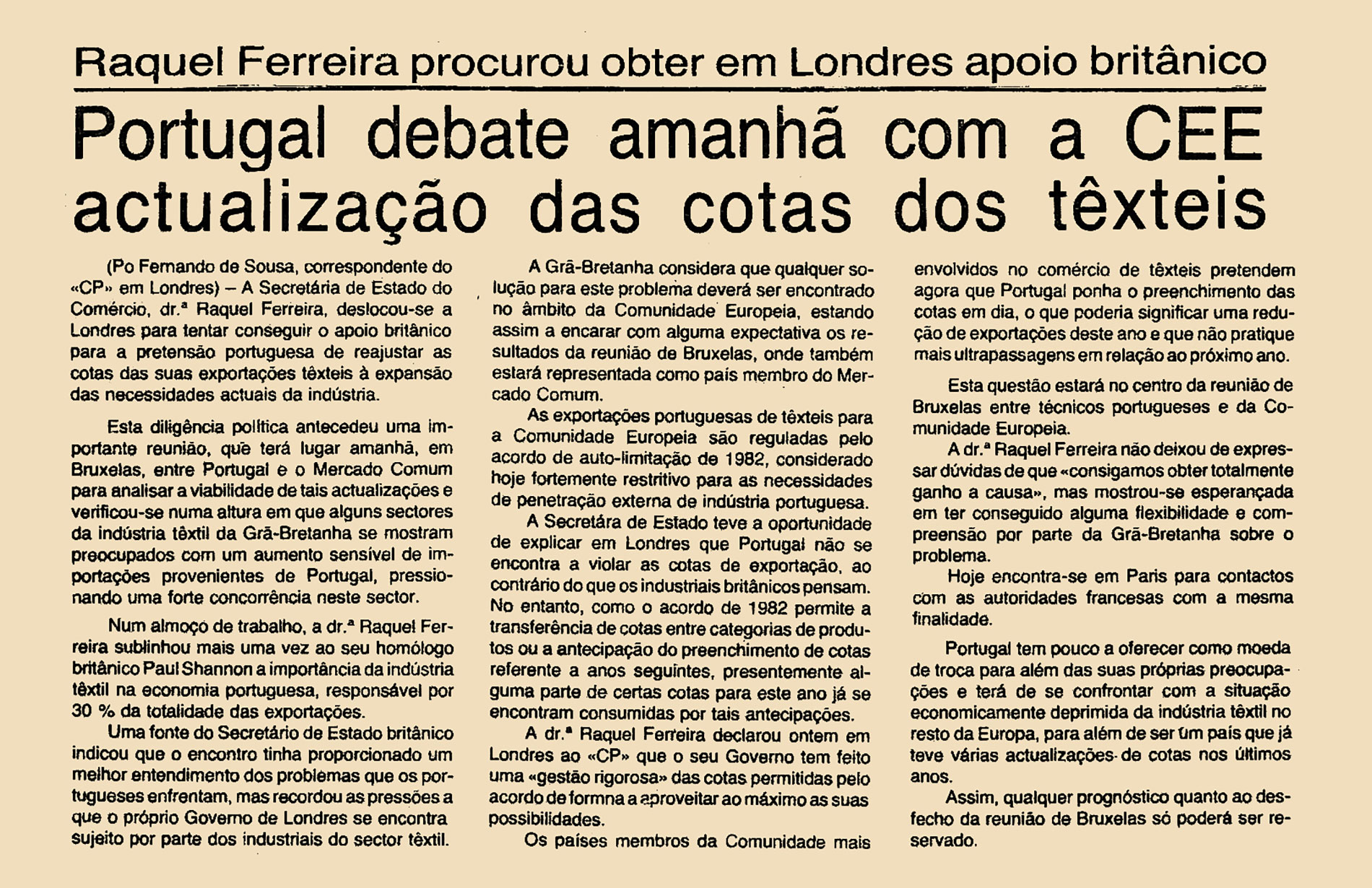 A Secretária de Estado do Comércio, Dr.ª Raquel Ferreira, deslocou-se a Londres para tentar conseguir o apoio britânico para a pretensão portuguesa de reajustar as cotas das suas exportações têxteis à expansão das necessidades actuais da indústria.