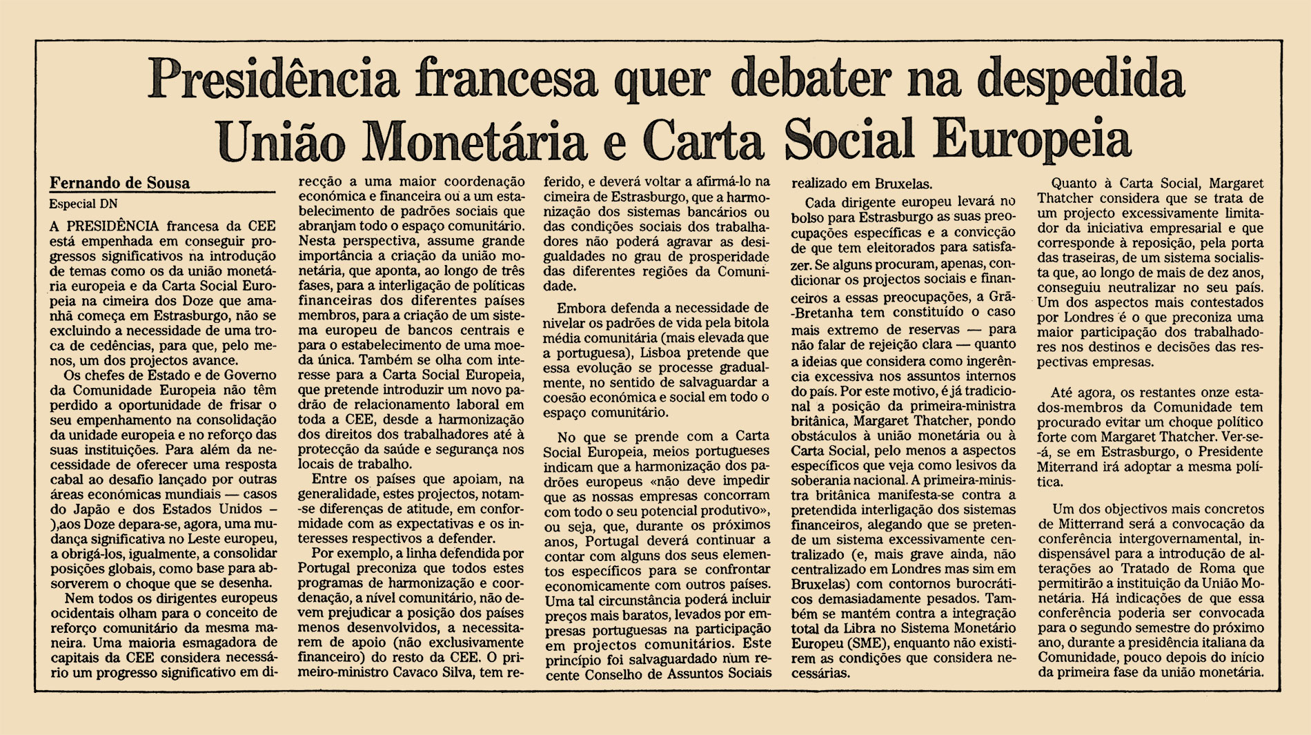 A presidência francesa da CEE está empenhada em conseguir progressos significativos na introdução de temas como os da união monetária europeia e da Carta Social Europeia na cimeira dos Doze que amanhã começa em Estrasburgo, não se excluindo a necessidade de uma troca de cedências, para que, pelo menos, um dos projectos avance.