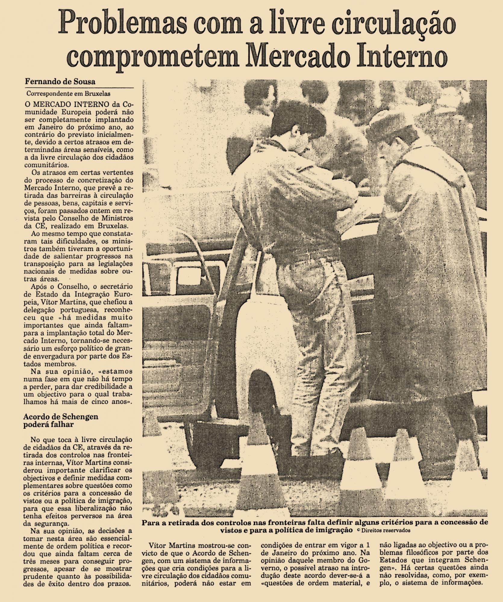 O Mercado Interno da Comunidade Europeia poderá não ser completamente implantado em Janeiro do próximo ano, ao contrário do previsto inicialmente, devido a certos atrasos em determinadas áreas sensíveis, como a da livre circulação dos cidadãos comunitários.