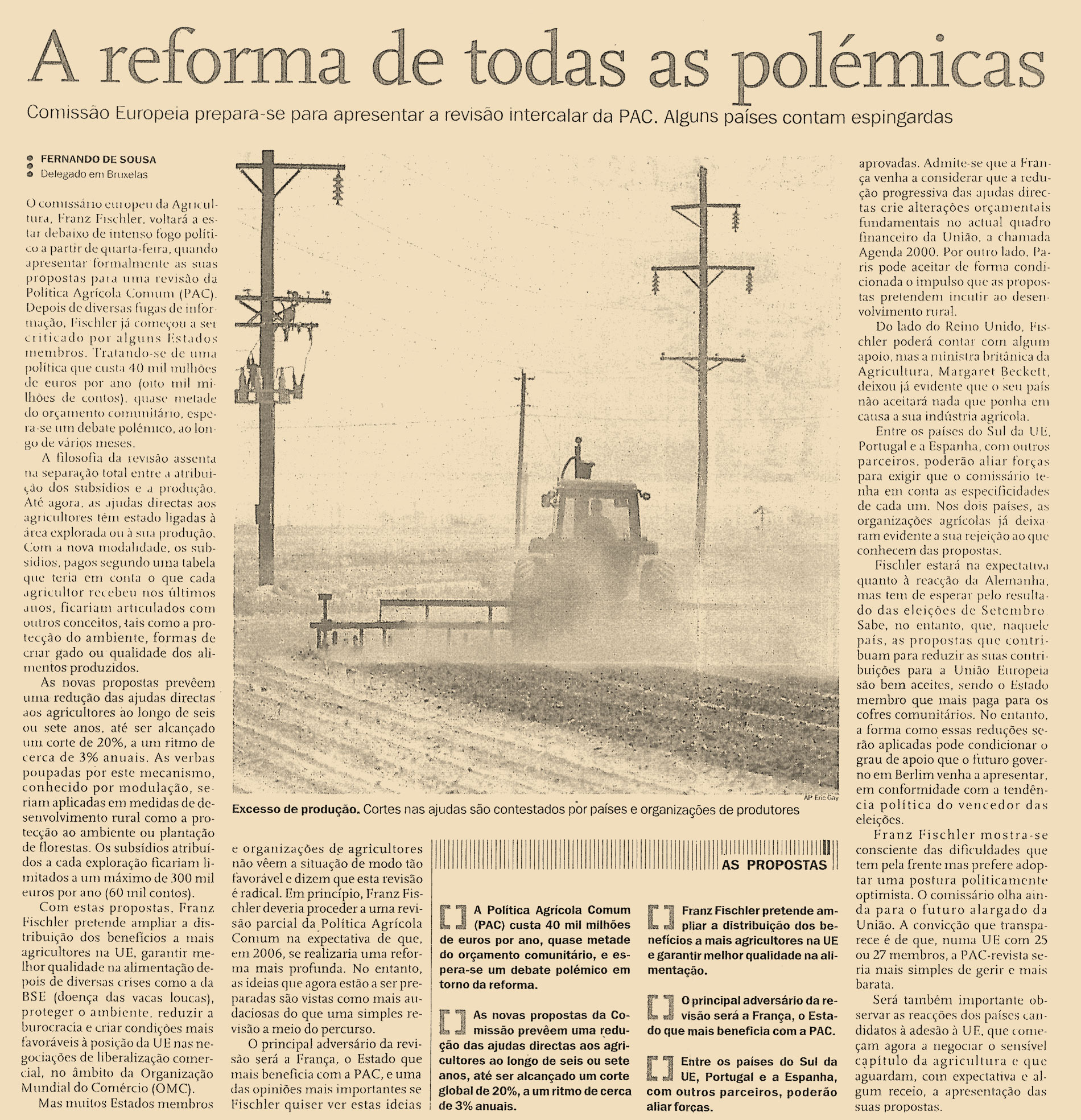 O comissário europeu da Agricultura, Franz Fischler, voltará a estar debaixo de intenso fogo político a partir de quarta-feira, quando apresentar formalmente as suas propostas para uma revisão da Política Agrícola Comum (PAC). Depois de diversas fugas de informação, Fischler já começou a ser criticado por alguns Estados membros. Tratando-se de uma política que custa 40 mil milhões de euros por ano (oito mil milhões de contos), quase metade do orçamento comunitário, espera-se um debate polémico, ao longo de vários meses.