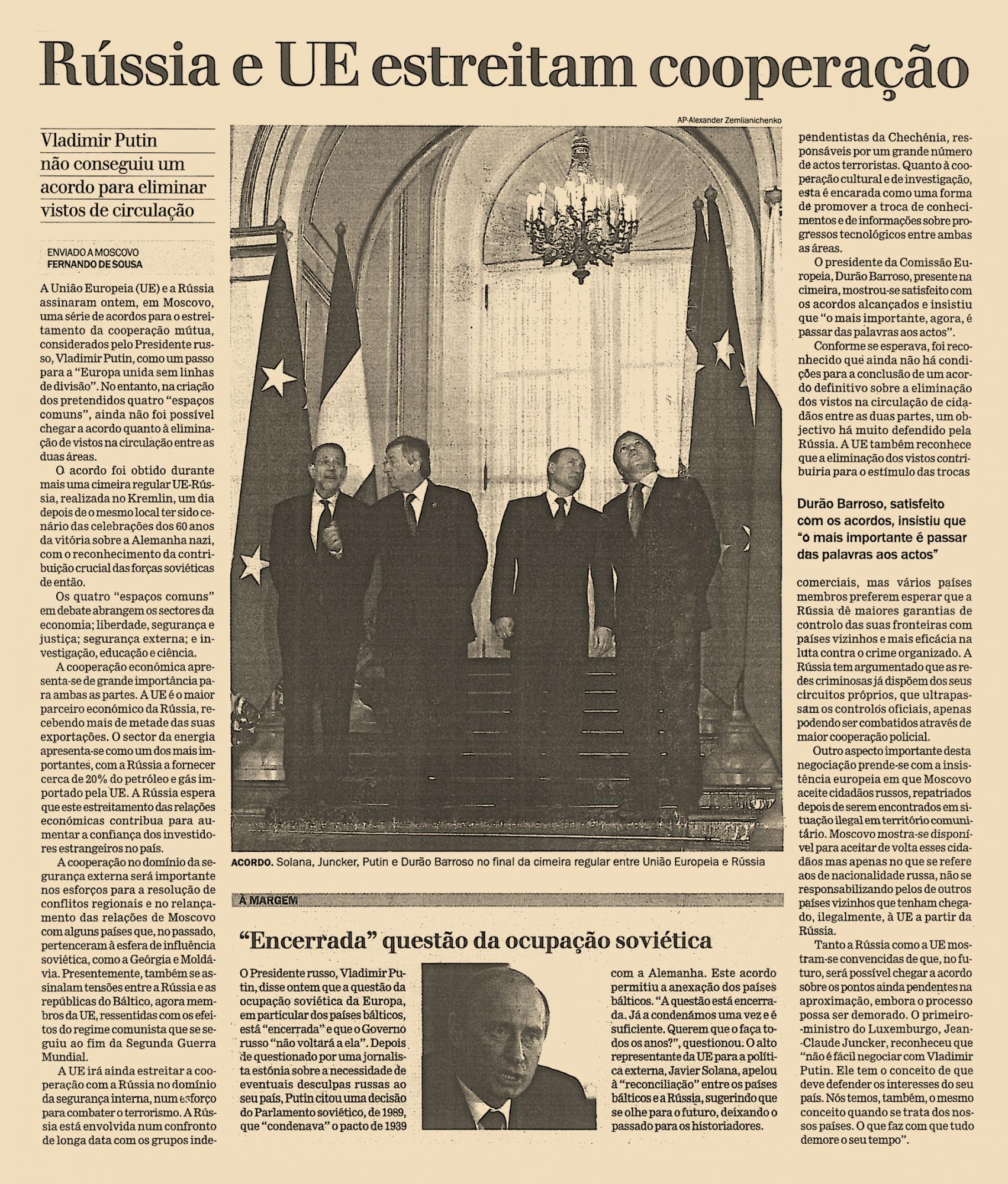 A União Europeia (UE) e a Rússia assinaram ontem, em Moscovo, uma série de acordos para o estreitamento da cooperação mútua, considerados pelo Presidente russo, Vladimir Putin, como um passo para a “Europa unida sem linhas de divisão”. No Entanto, na criação dos pretendidos quatro “espaços comuns”, ainda não foi possível chegar a acordo quanto à eliminação de vistos na circulação entre as duas áreas.