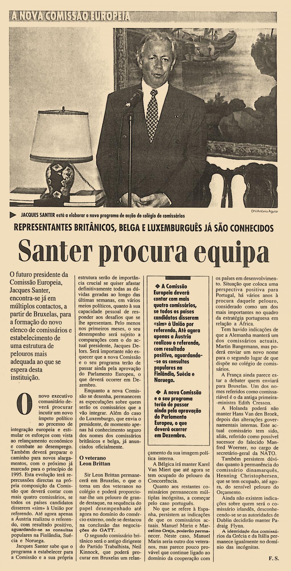 O futuro presidente da Comissão Europeia, Jacques Santer, encontra-se já em múltiplos contactos, a partir de Bruxelas, para a formação do novo elenco de comissários e estabelecimento de uma estrutura de pelouros mais adequada ao que se espera desta instituição.