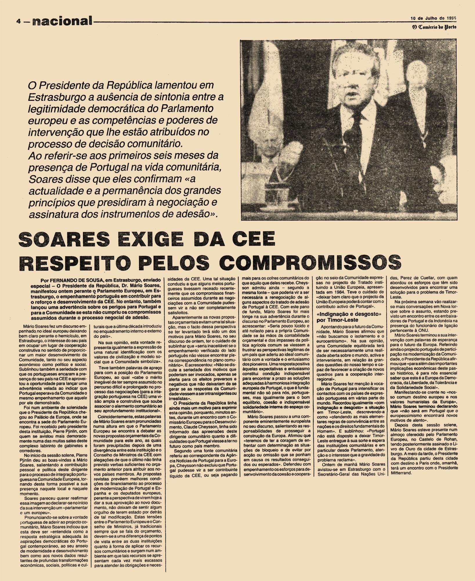 O Presidente da República lamentou em Estrasburgo a ausência de sintonia entre a legitimidade democrática do Parlamento europeu e as competências e poderes de intervenção que lhe estão atribuídos no processo de decisão comunitário. Ao referir-se aos primeiros seis meses da presença de Portugal na vida comunitária, Soares disse eu eles confirmam “a actualidade e a permanência dos grandes princípios que presidiram à negociação e assinatura dos instrumentos de adesão”.