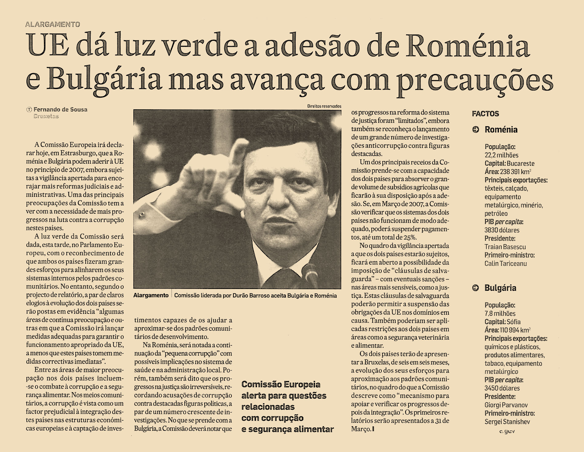 A Comissão Europeia irá declarar hoje, em Estrasburgo, que a Roménia e Bulgária podem aderir à EU no princípio de 2007, embora sujeitas a vigilância apertada para encorajar mais reformas judiciais e administrativas. Uma das principais preocupações da Comissão tem a ver com a necessidade de mais progressos na luta contra a corrupção nestes países.