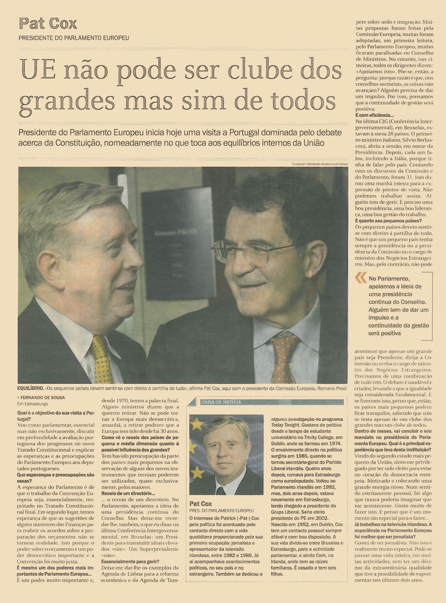 Presidente do Parlamento Europeu inicia hoje uma visita a Portugal dominada pelo debate acerca da Constituição, nomeadamente no que to ca aos equilíbrios internos da União.