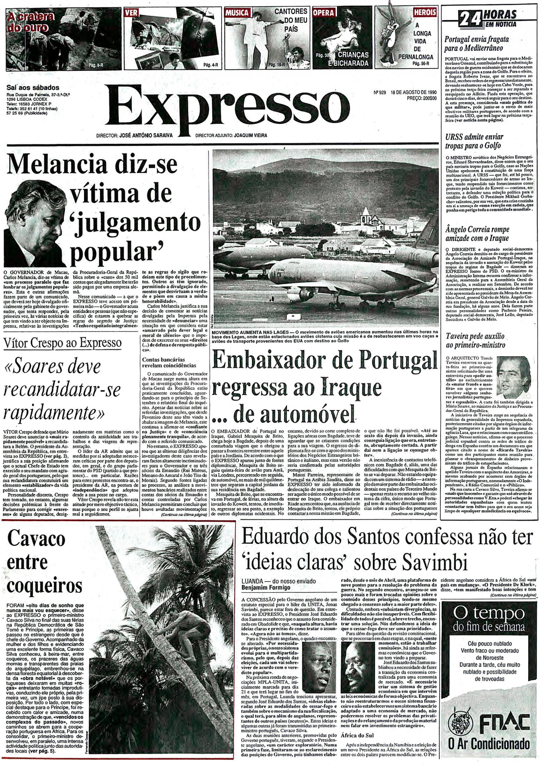 No ano em que o Expresso publicou a sua maior edição de sempre — pesava 1,8 kg —, uma das primeiras páginas que ficou famosa foi a de 18 de agosto. Não tanto pela manchete, sobre o caso do então governador de Macau, Carlos Melancia, que vinha a público desmentir ter recebido “luvas” de uma empresa alemã, mas mais por causa de uma foto do chefe do Governo, o reservado e formal Cavaco Silva, fotografado a subir em fato de banho a um coqueiro em São Tomé. “Foram oito dias de sonho que nunca mais vou esquecer”, disse ao Expresso.